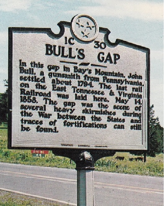 In 1792 John Bull received a grant for 55 acres near the east-west passage over Bays Mountain. Capitalizing on his location, Bull operated a stage line through the passage that quickly became known as Bull’s Gap.