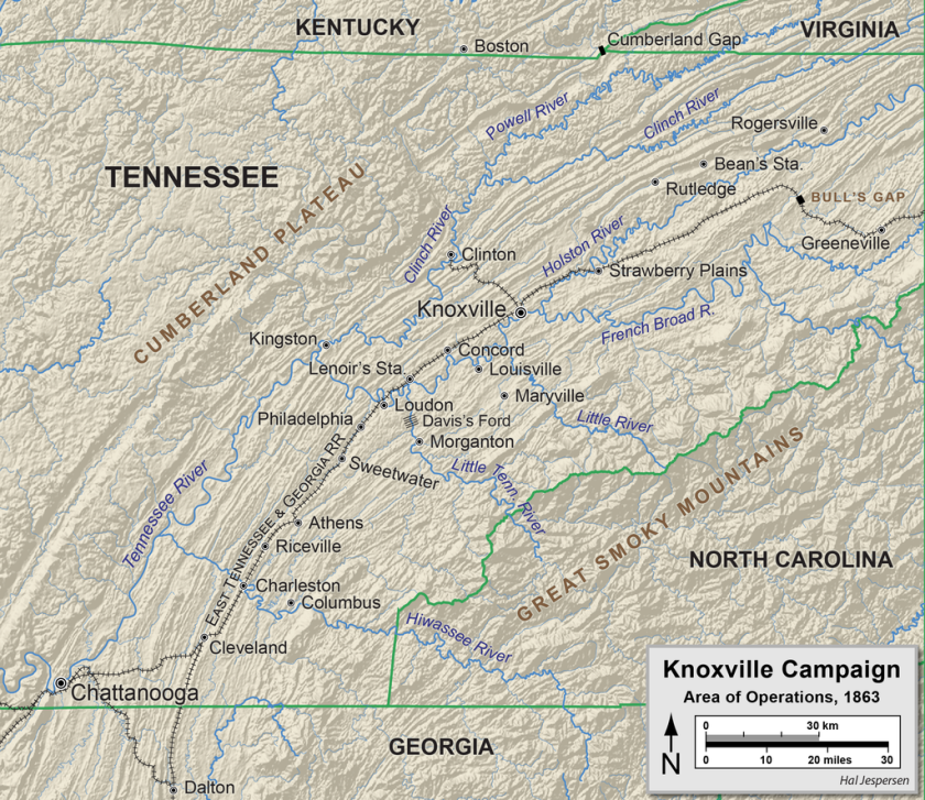 12 NOVEMBER 1863 KNOXVILLE. Federal situation report We now hold as far east as Bull’s Gap, scouting to Greeneville and to the south of that place. We picket the Tennessee River from Washington to Kingston. The main force is stationed from Kingston to Knoxville. We occupy all the country south of the Holston, scouting the line of the Little Tennessee. The command is in good health and spirits; very short of clothing and on quarter rations of everything but meat and bread. … OR, Ser. I, Vol. 31, pt. III, p. 128.