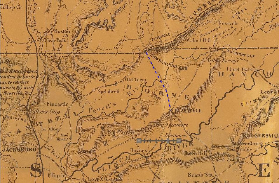 A period map showing Tazewell and surrounding area. Dashed blue line indicates the route of De Courcy’s brigade.