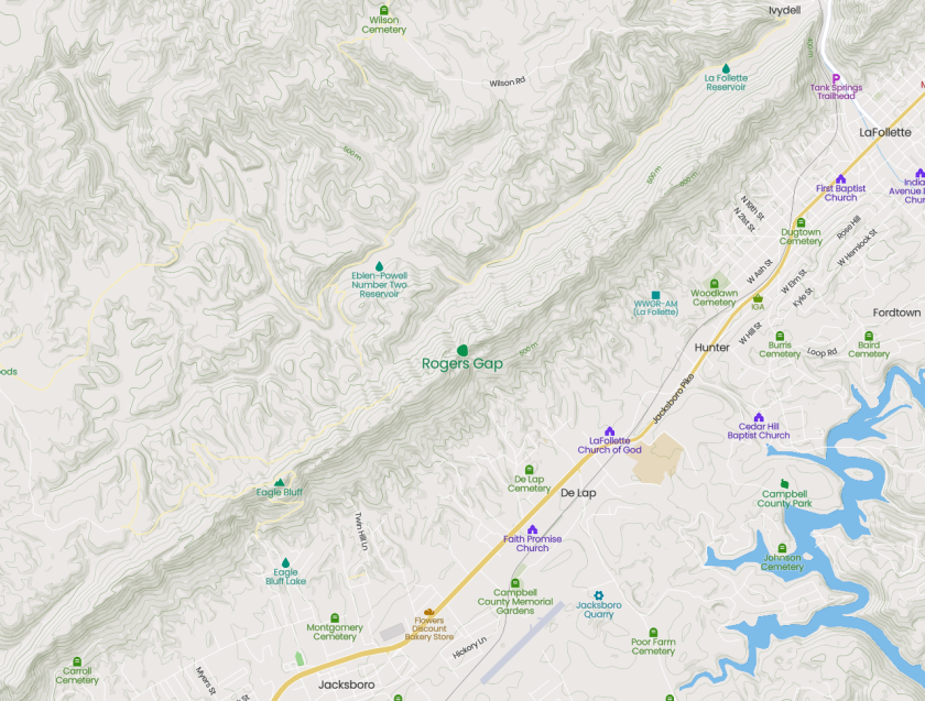 Bull’s Gap [now Bulls Gap] is a town in the southeastern corner of Hawkins County, Northeast Tennessee, near a gap of the same name in Bays Mountain—part of the Ridge-and-Valley Appalachians. These Appalachians form a broad arc between the Blue Ridge Mountains and the Appalachian Plateau and are made up of long ridges with continuous valleys in between. Bays Mountain runs northeast to southwest, from Kingsport to just south of Knoxville. The northern segment has peaks reaching up to 3,000 feet. It is not a single ridge, but a series of ridges. The tallest peak is Chimneytop Mountain (3,117 feet). en.wikipedia.org/wiki/Bays_Mountain